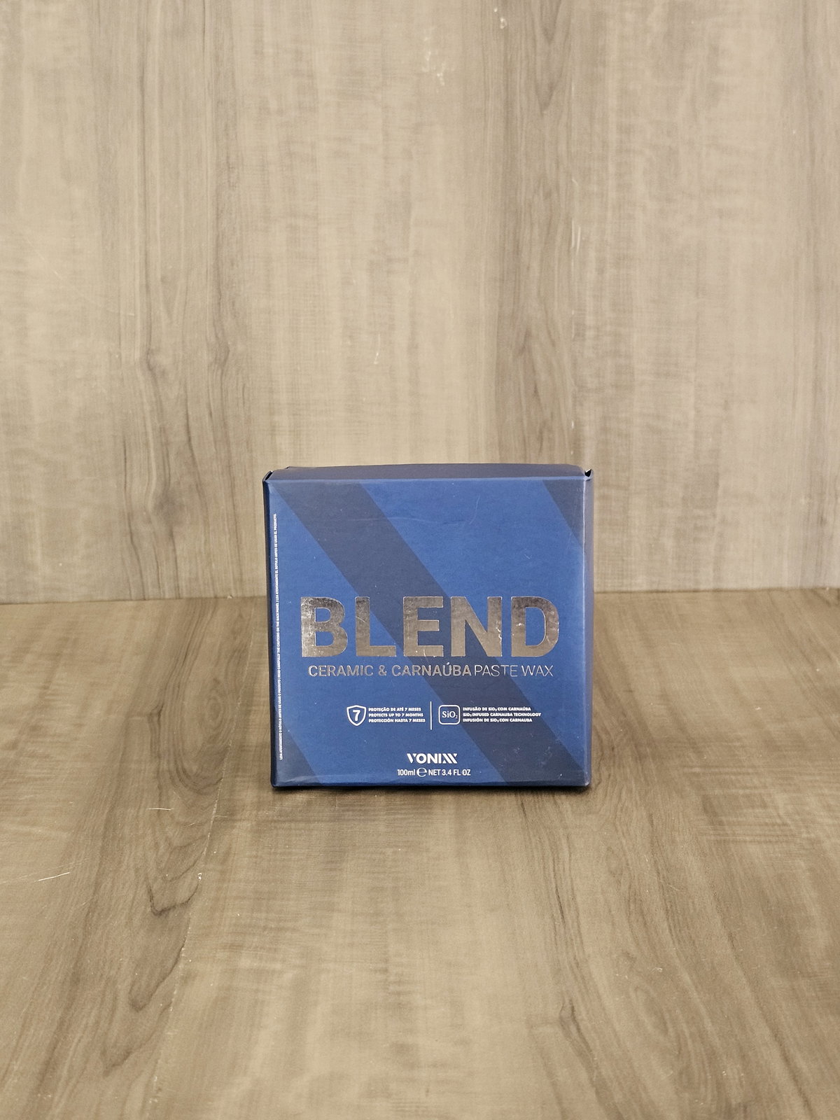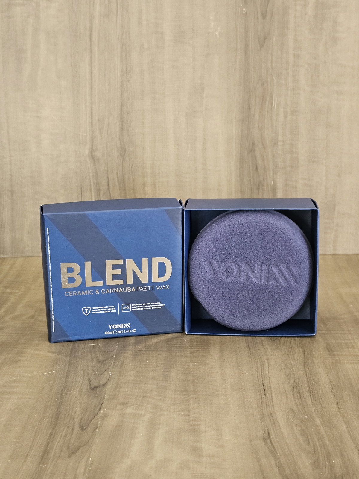 Blend ceramic & carnauba paste wax es una cera hibrida compuesta por SiO2 y carnauba, protege las superficies vehiculares por hasta 7 meses. El producto promueve la resistencia cerámica, brillo cálido de la carnauba y la hidro repelencia. Envase de 100g. Incluye aplicador de poliespuma.